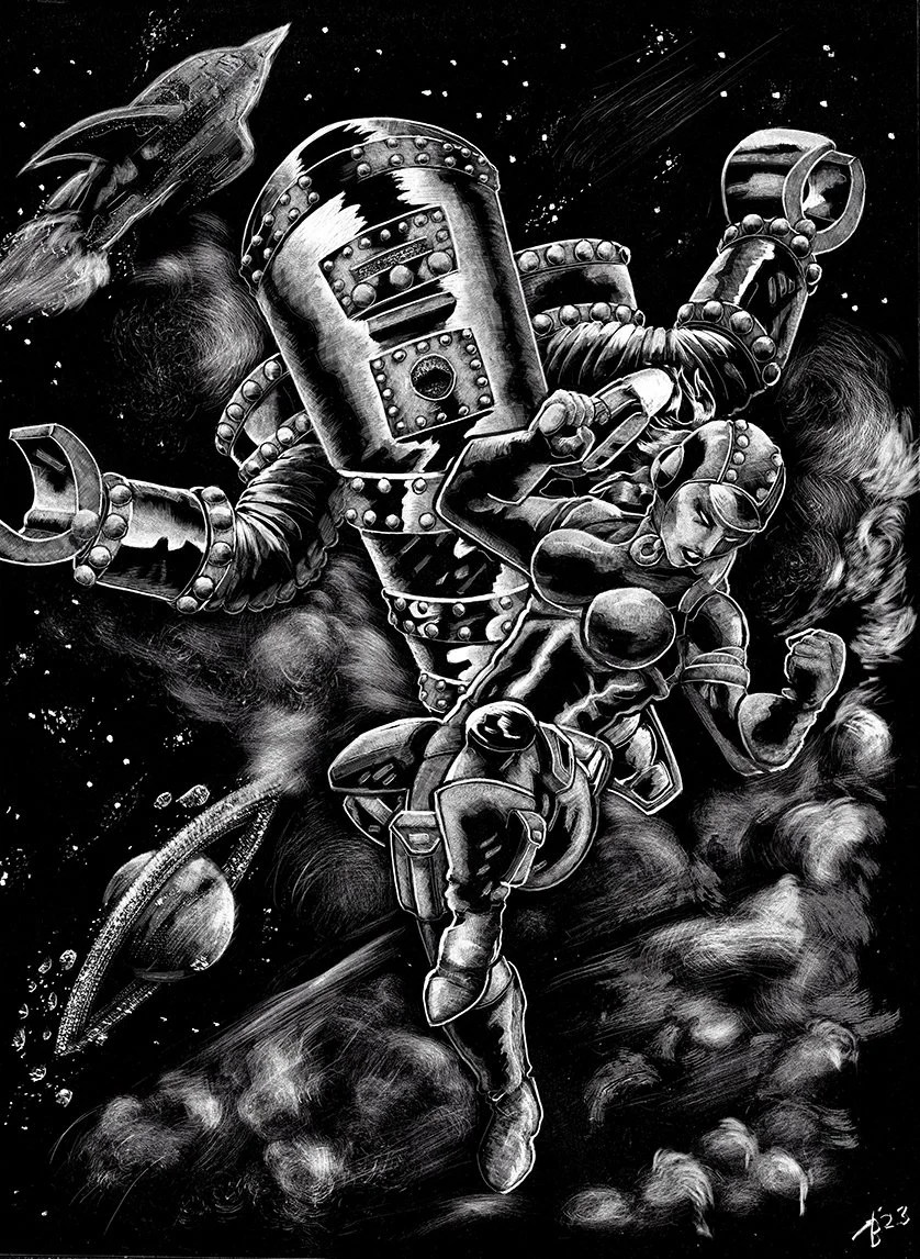 "Satan's Robot" was as 9"x12" scratchboard commission to create a old school robot (not Robby the Robot from Forbidden Planet). I wanted to show the 1930's fear and menace of robotics.